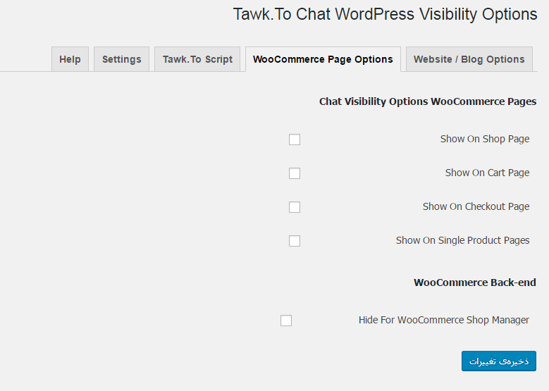 قابلیت مشاهده پنجره چت برای نمایش آن در وب سایت ، در داشبورد، برای صفحات WooCommerce و با کد کوتاه این قسمت رو کنترل کنید .